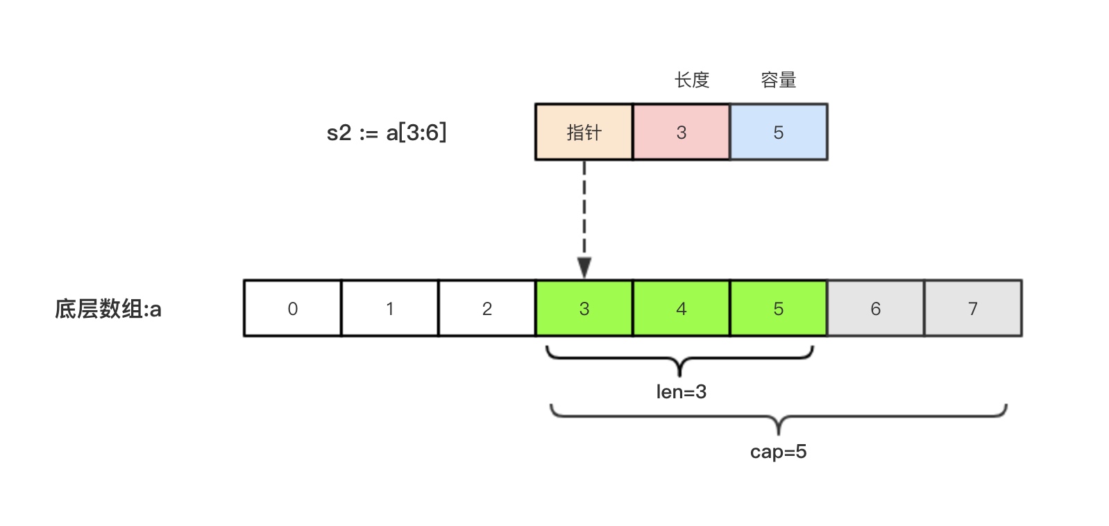 切片底层引用了一个数组,由三个部分构成 —— 指针、长度和容量,指针指向数组起始下标,长度对应切片中元素的个数,容量则是切片起始位置到底层数组结尾的位置: